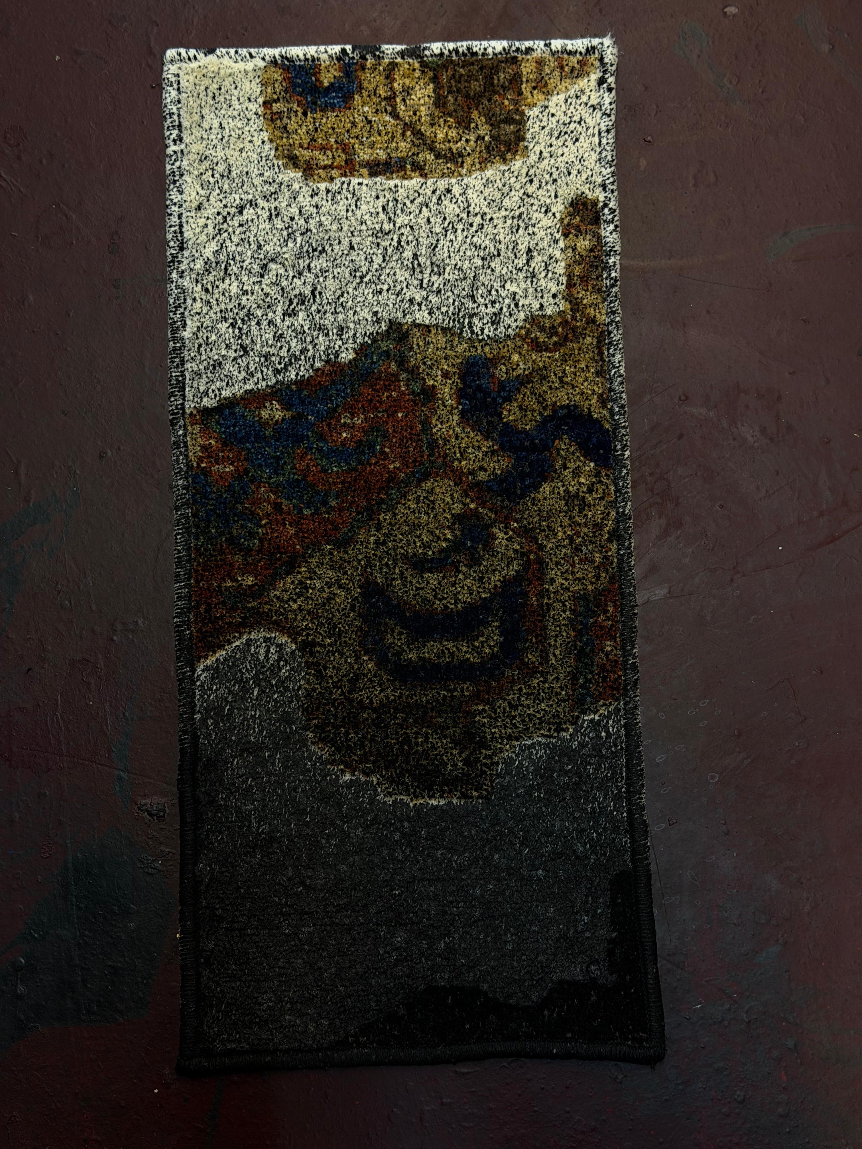 For me, site-specific work has always been about creating a dialogue between the artwork, the architecture, and the space it inhabits. That is what draws me to CulturalxCollabs and its idea of fragmenting a single carpet into 100 pieces that travel across the world. What struck me most was the history embedded in this particular carpet - it was burned. And that connected immediately to something I have been doing in my own paintings for years: creating a burnt effect using black paint. So that is exactly what I did. I painted the carpet to make it look as though it had been burned, as a way of reconnecting it to its own history. For me it was a natural gesture - the technique was already part of my practice, and here it found its most direct meaning yet.