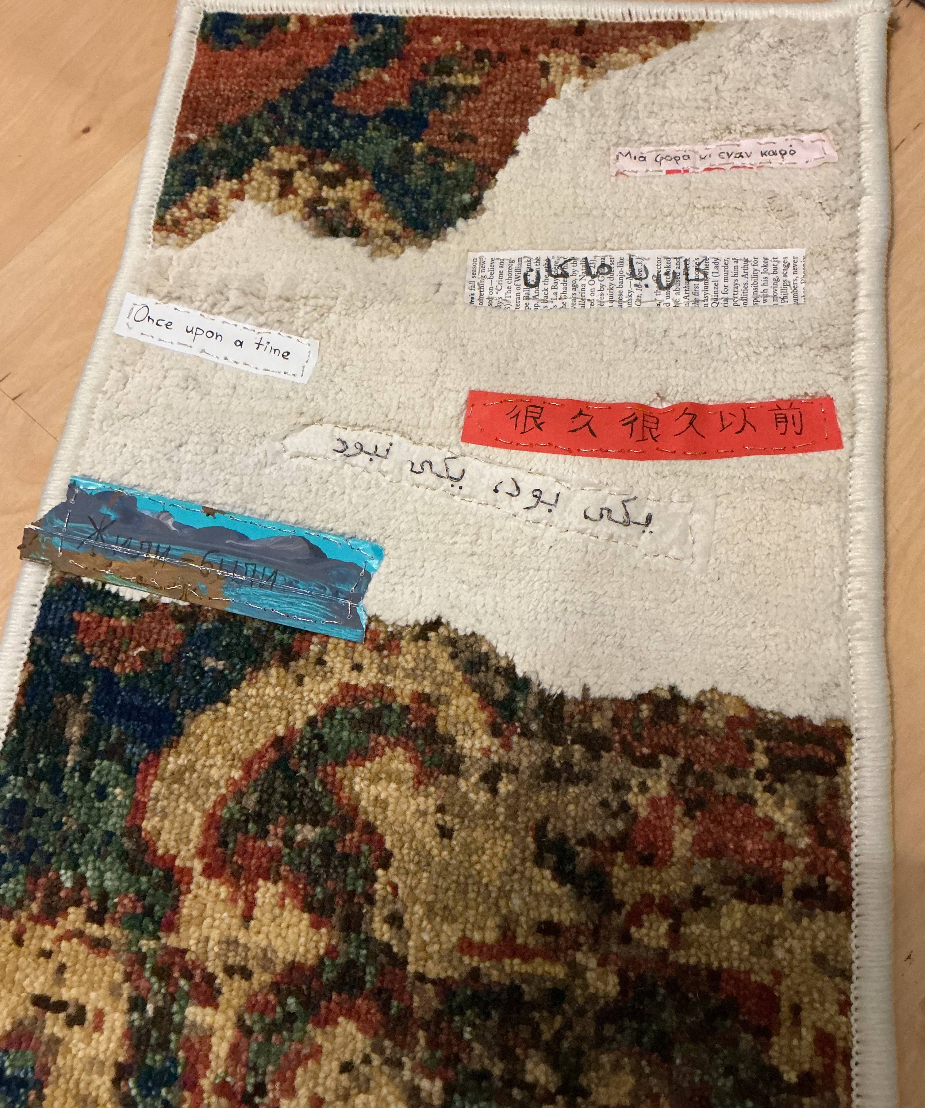 My addition to the fragment itself - The phrase/or equivalent "Once Upon A Time" written in 10 different languages, on 10 different paper textures and sewed with a golden thread on the carpet.