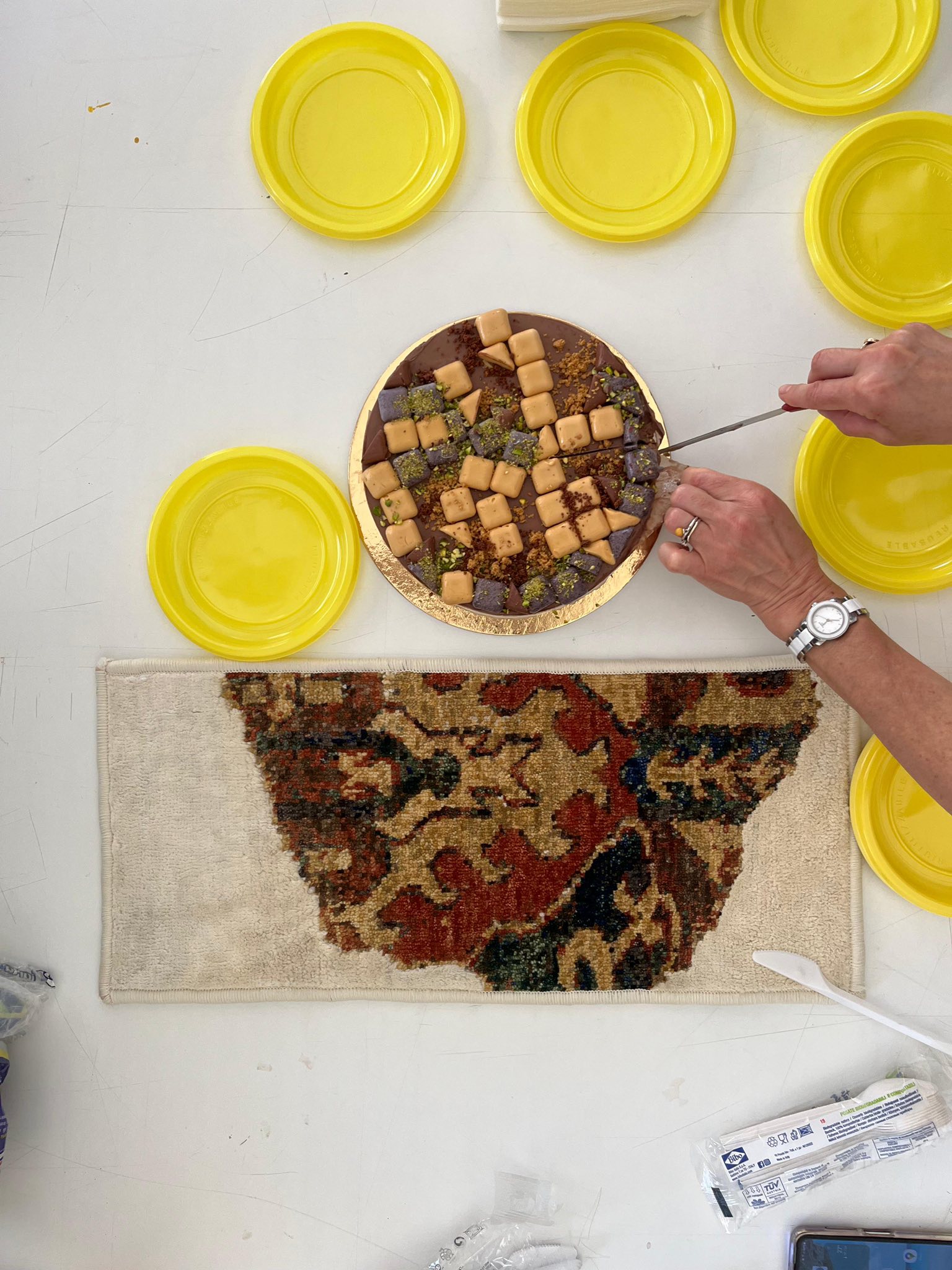 The geometric pattern of squares and triangles inspired me to try to recreate, if not the tapestry motif, then at least the color combination of the fragment using gelato cubes. Sandra, the owner of the gelato shop, created a 28 cm diameter icecream cake topped with chocolate gelato and a lot of 2x2 cm cubes of different types of gelato. The most suitable colors were milk chocolate, gelato with Olive pâté with orange variegation, salted caramel, and dark chocolate sorbet. To increase a reminiscent of carpet, I sprinkled with chopped chocolate biscuit and chopped pistachios between the cubes. Thus, this ice cream cake, in the tones of an ancient carpet, is a celebration of the ancient art of carpet-making, both authentic and the artisanal excellence and pursuit of innovation that are Baldo Gelato's hallmarks, which are the weft and warp of Italian craftsmanship expressed through the applied arts, but also through the culinary arts.