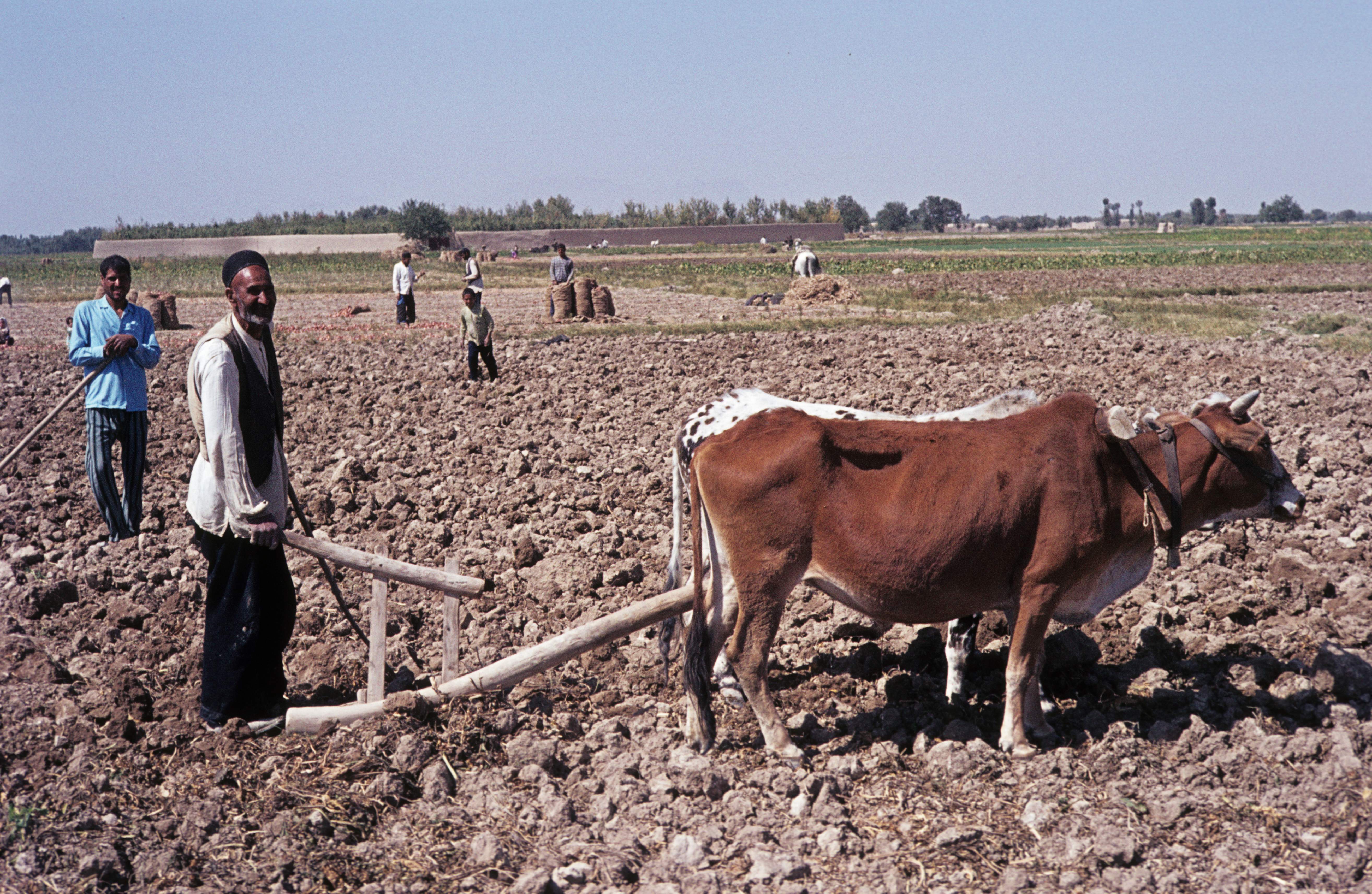 Farmers plowing the land with cattle.