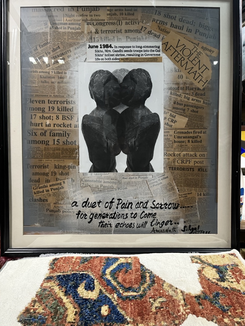 Die Collage des Künstlers Amarnath Sehgal handelt von der Erstürmung des Goldenen Tempels im Jahr 1984 und ihren Folgen. Dies ist nach wie vor ein Moment tiefer Reflexion – ein Moment, in dem Fragen nach Macht, Glauben und Erinnerung weiterhin die zeitgenössischen Narrative prägen.