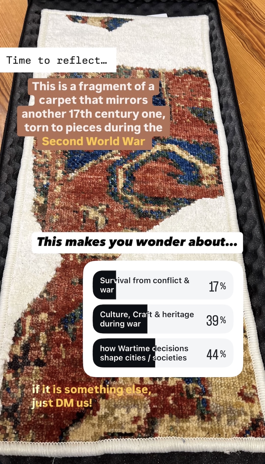 Ich wandte mich an die Instagram-Community von The Heritage Lab, um zunächst zu verstehen, was das Teppichfragment für sie bedeutete. Dies ist ein Screenshot der Story-Umfrage. Von den 1726 Befragten fragten sich 44 %, wie Entscheidungen in Kriegszeiten Städte und Gesellschaften prägen.