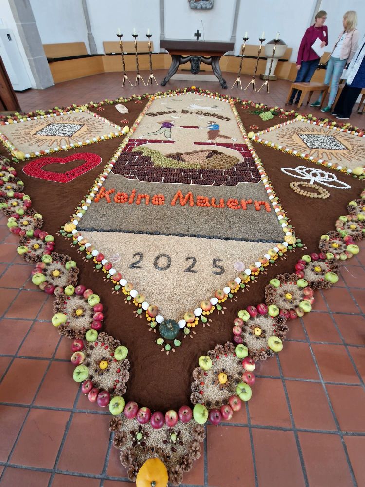In der Kirche St. Maria Heimsuchung in Herten ist es Tradition, in jedem Jahr zum Erntedankfest für zwei Wochen einen Früchteteppich im Altarraum zu gestalten. Er ist ein Glaubenszeichen des Dankes und eine Erinnerung an die Bewahrung der Schöpfung. Das bunte Kunstwerk besteht aus unzähligen Äpfeln, Zwiebeln, Kohl, Mais, Kastanien, Kürbissen, Eiern, Erbsen, Nüssen, Bohnen, Obst, 75 kg Getreide, Reis, Chiasamen, Linsen, Kaffee, Muscheln und vielen anderen Naturmaterialien und wird in vielen, vielen Stunden von einem Team mit mehreren Frauen entworfen und gelegt. Zahlreiche Besucher kommen dann aus immer weiterer Entfernung.