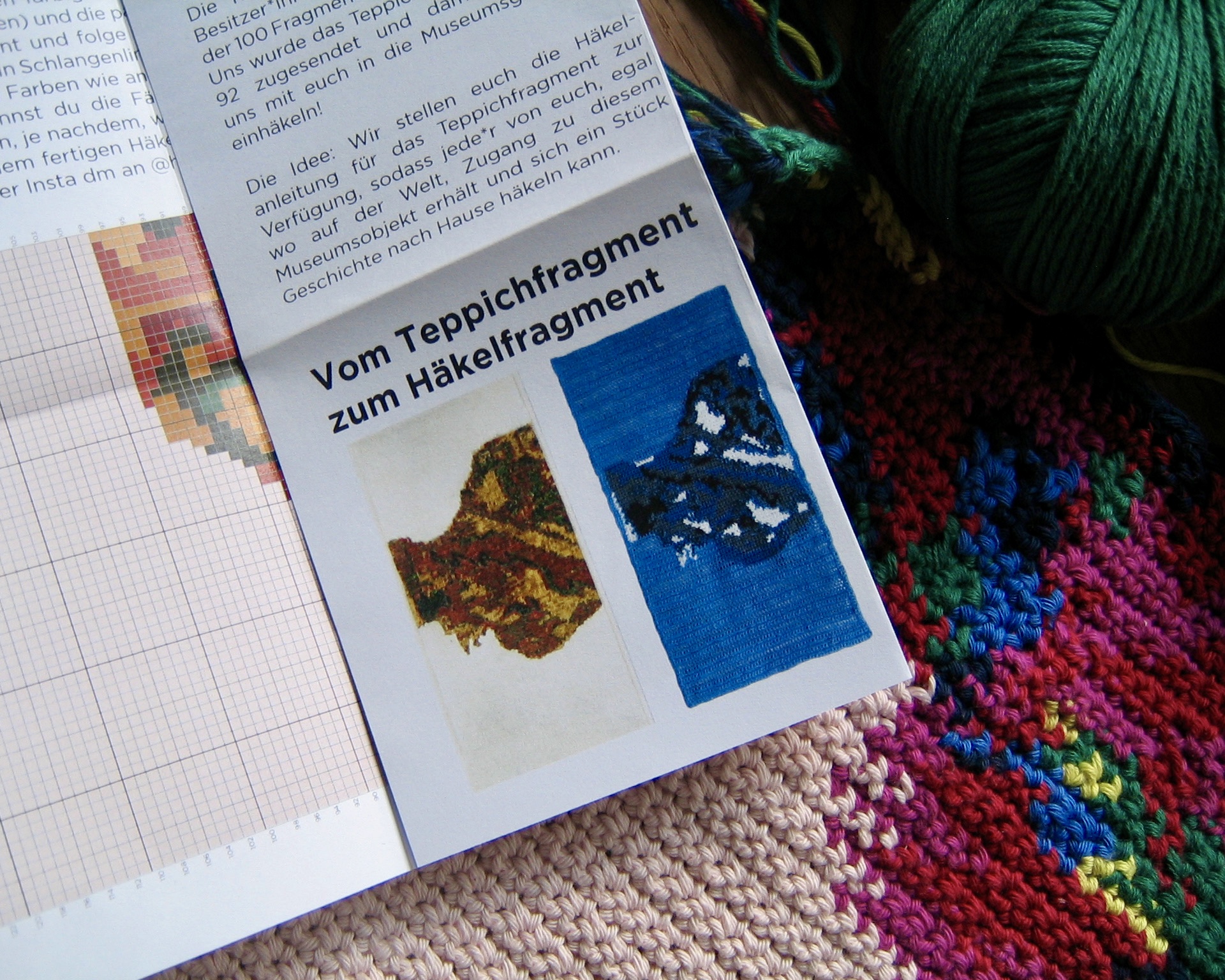 Dafür haben sie das Teppichfragment in eine Vorlage zum Nachhäkeln übersetzt, um weltweit allen Menschen zu ermöglichen, sich das Teppichfragment direkt nach Hause zu häkeln. Bei der Farb- und Garnwahl sind der Fantasie keine Grenzen gesetzt und so entstehen viele unterscheidliche Unikate überall auf der Welt, die die Menschen und ihr Zuhause nun mit dem Museum in Verbindung bringen.