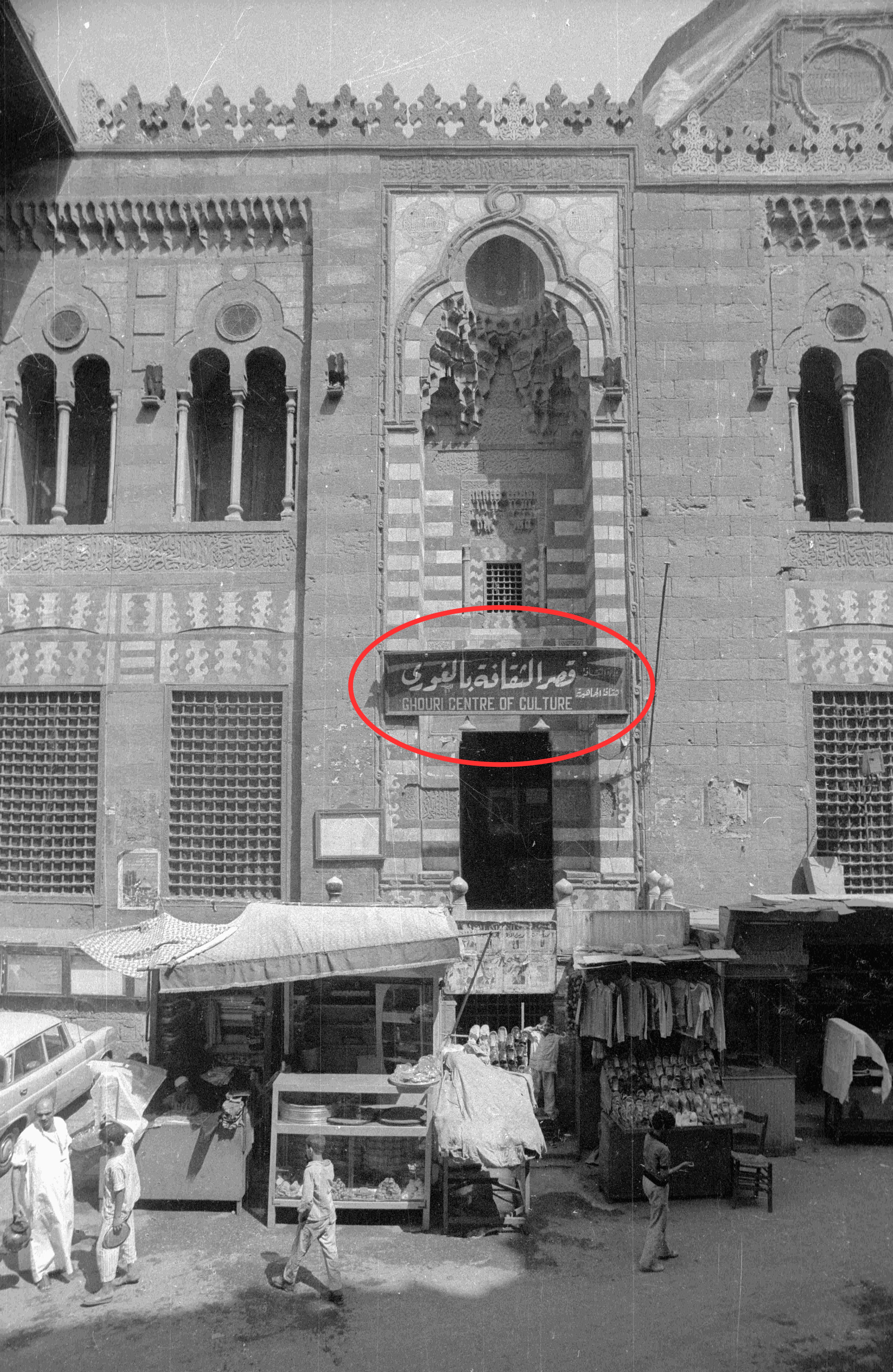 Die Tafel am Seiteneingang dieses Teils der al-Ghuri-Anlage (909/1504–910/1505) bezeichnet den Sabil-Kuttab in der al-Azhar-Straße als „Vereinigung Sayyidna al-Husain zur Bewahrung des Korans und zur Erleichterung von Hadsch und Umra für die Mitglieder“. Wahrscheinlich diente der Kuttab dem Auswendiglernen des Korans, während der Sabil als Vereinsstätte genutzt wurde. Heute existiert keine soziale Organisation in Ägypten unter diesem Namen. Aufnahme von 1978.