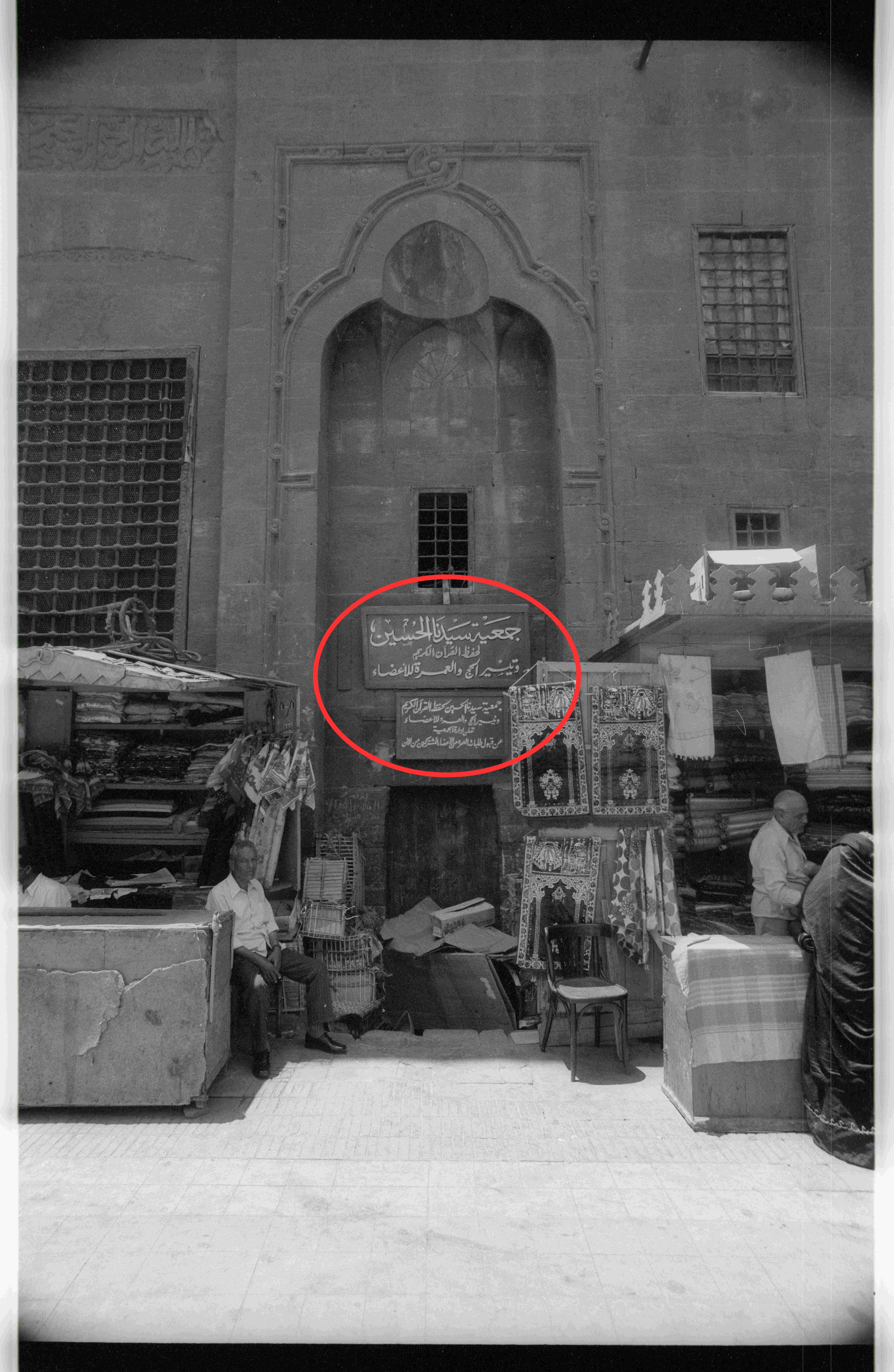Ein Mann, vermutlich der Besitzer des Ladens links, zeigt die Überreste des Fatimidischen Baus, darunter die Gründungsinschrift in Kufi-Schrift der Zawiya Dscha‘far as-Sadiq (496/1101), erbaut unter dem Kalifen al-‘Āmir bi-Aḥkām Allāh. Die Inschrift befindet sich heute im Museum für Islamische Kunst in Kairo (Nr. 113). Aufnahme von 1971.