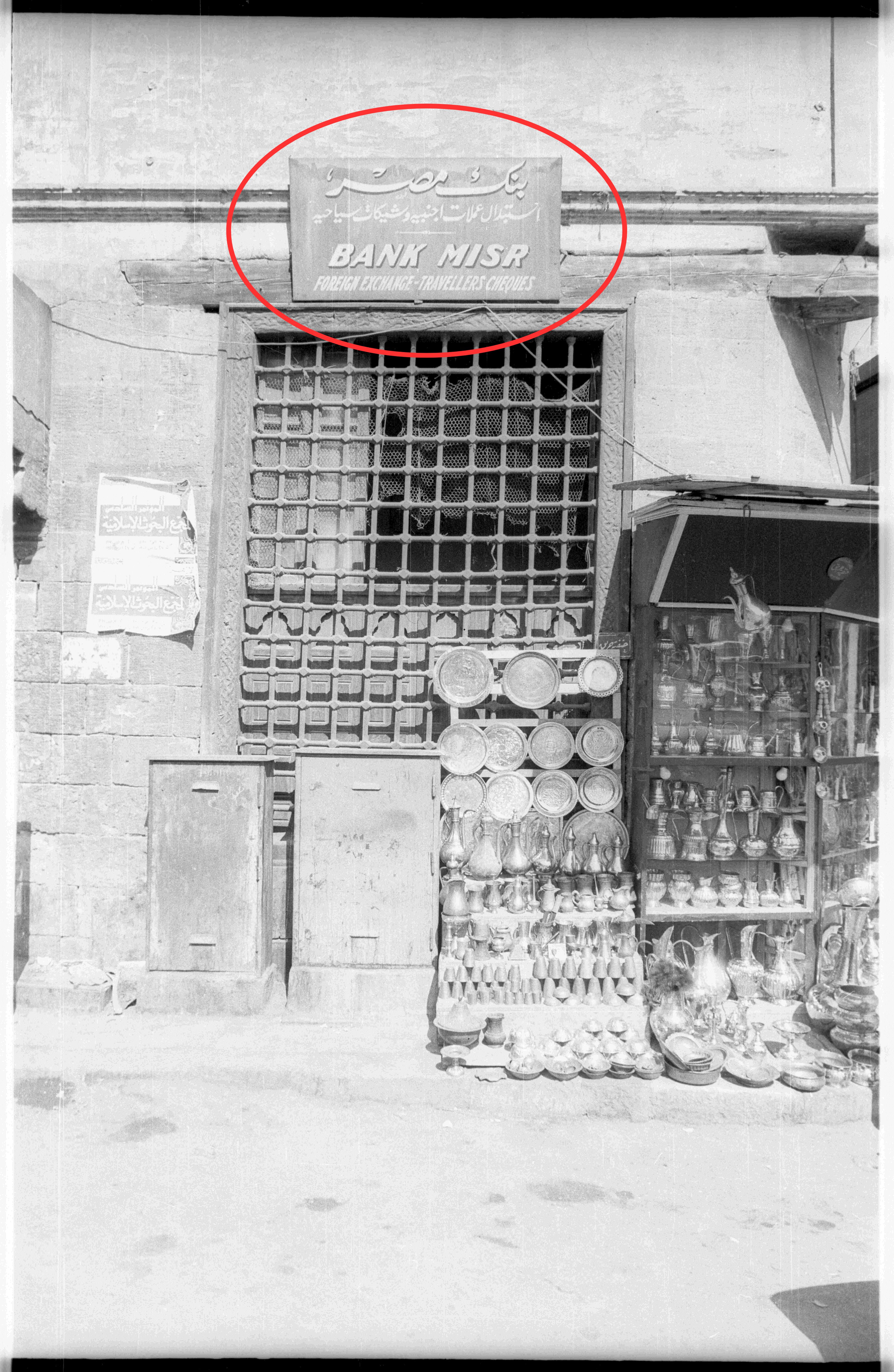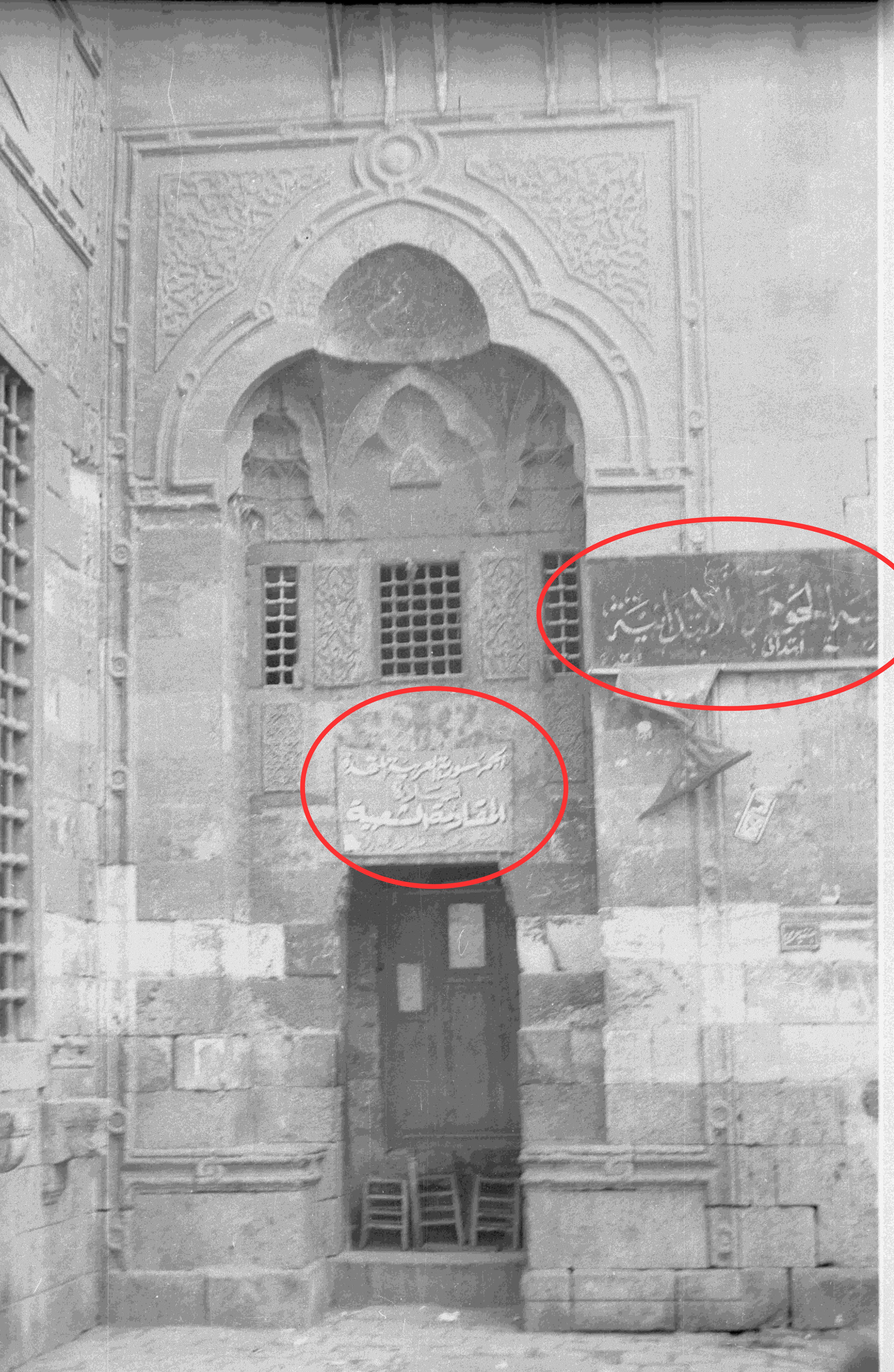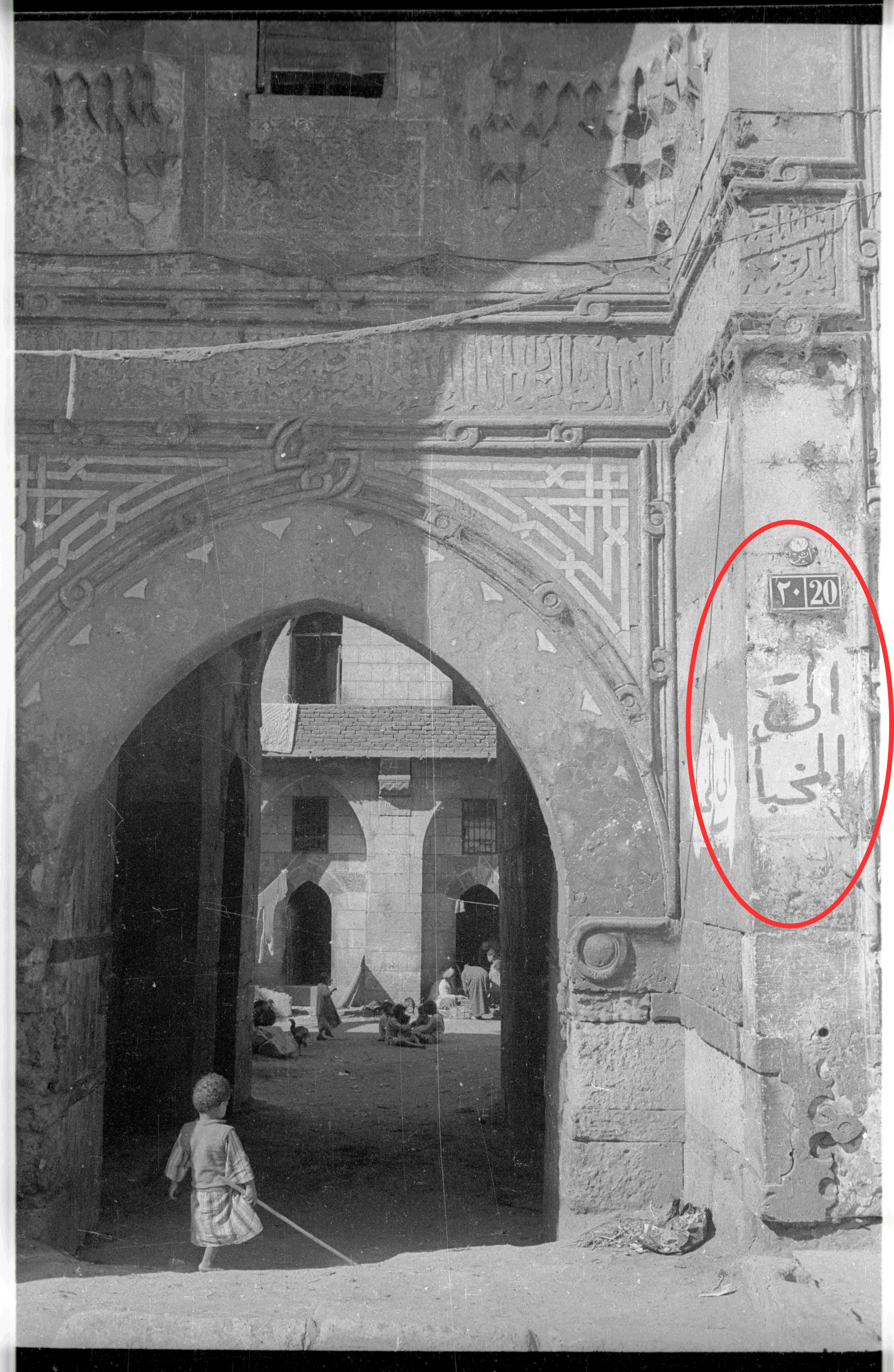 Die Aufnahme zeigt nicht nur den Schutzraum und die kriegsbedingte Nutzung der Wikala, sondern auch eine Inschrift rechts am Eingang, die noch erhalten war. Laut Max van Berchem dokumentiert diese die öffentliche Empörung im Jahr 886/1481, ausgelöst durch Gerüchte über die Einführung einer neuen, leichteren Münze. Sultan al-Aschraf Qaitbay berief daraufhin eine dringende Versammlung mit seinen Beamten ein, bei der beschlossen wurde, die alten und neuen Münzen zu wiegen, um Betrug zu verhindern.