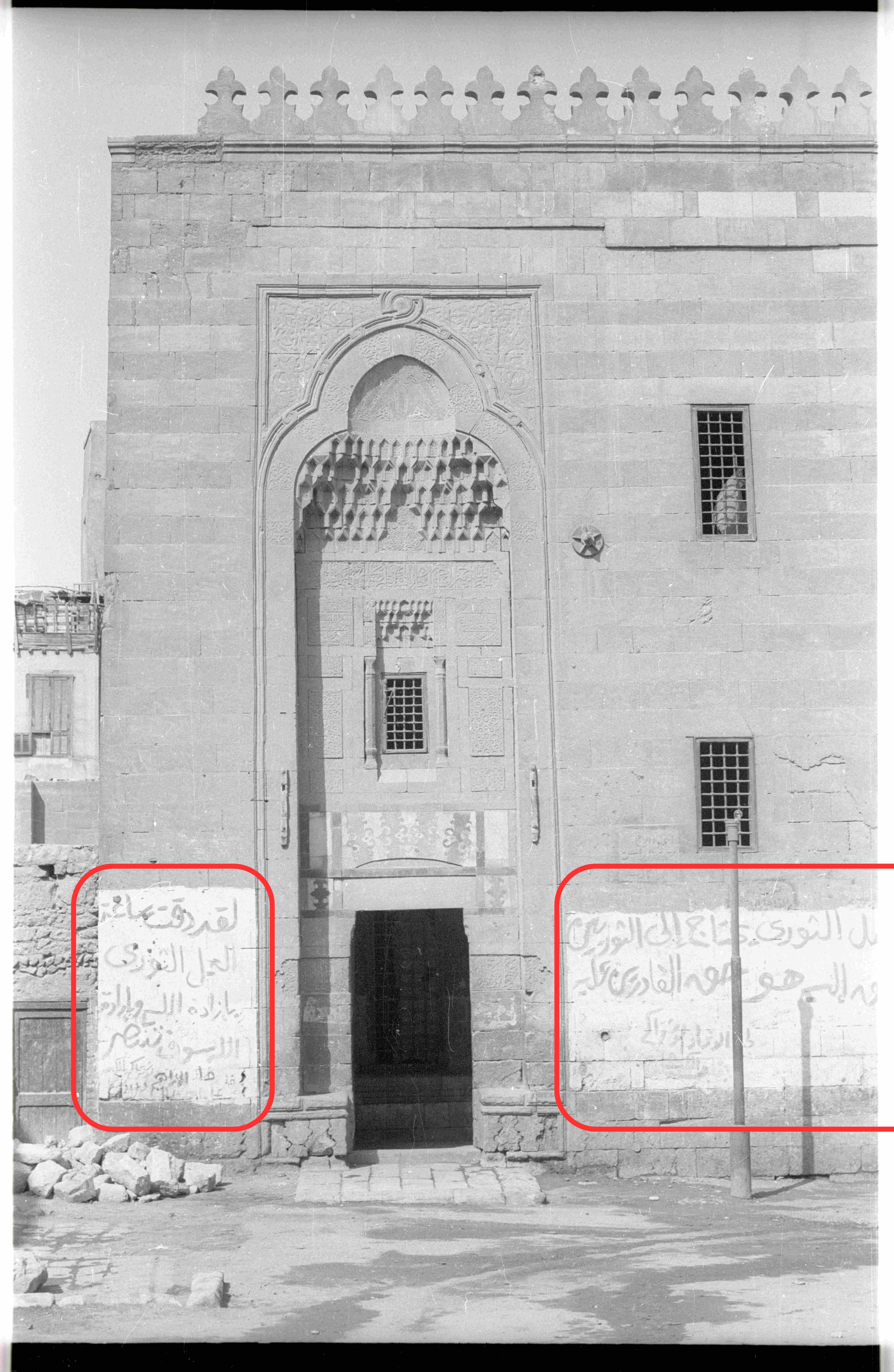 Die Aufnahme von 1969 spiegelt das angespannte soziale und politische Klima in den ägyptischen Straßen zwischen 1967 und 1973 wider. Über dem Eingang der Qaitbay-Moschee in der Zitadelle von Qal‘at al-Kabsh (880/1475) ist die Parole zu lesen: „Die Stunde der revolutionären Arbeit hat geschlagen“.