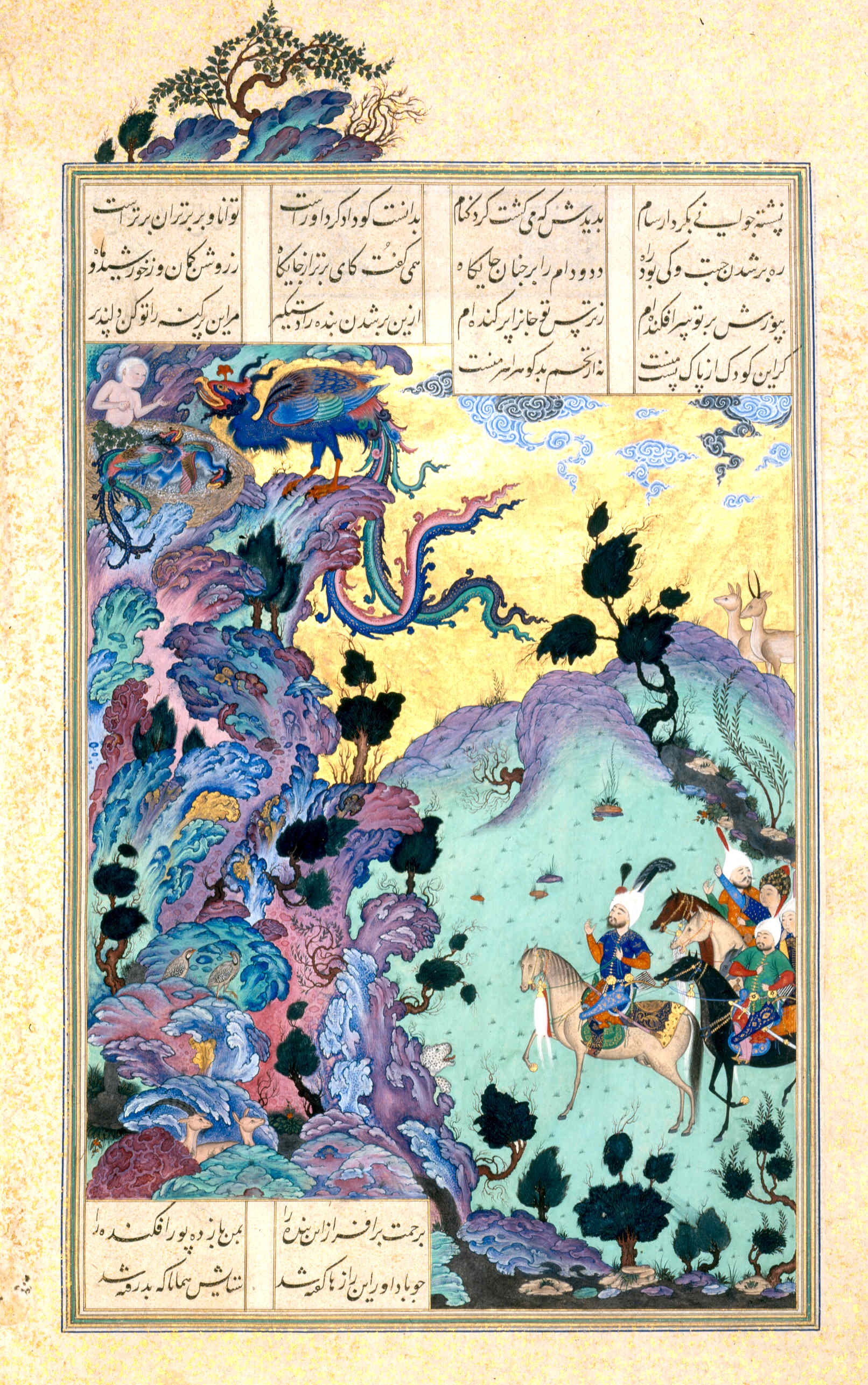 Das Albumblatt zeigt die Geschichte von Simurgh und dem Vater-Sohn-Duo Sam und Zal am Berg Alborz. Dieses Blatt ist seit 1977 Teil der Sammlung des Museums für Islamische Kunst in Berlin.