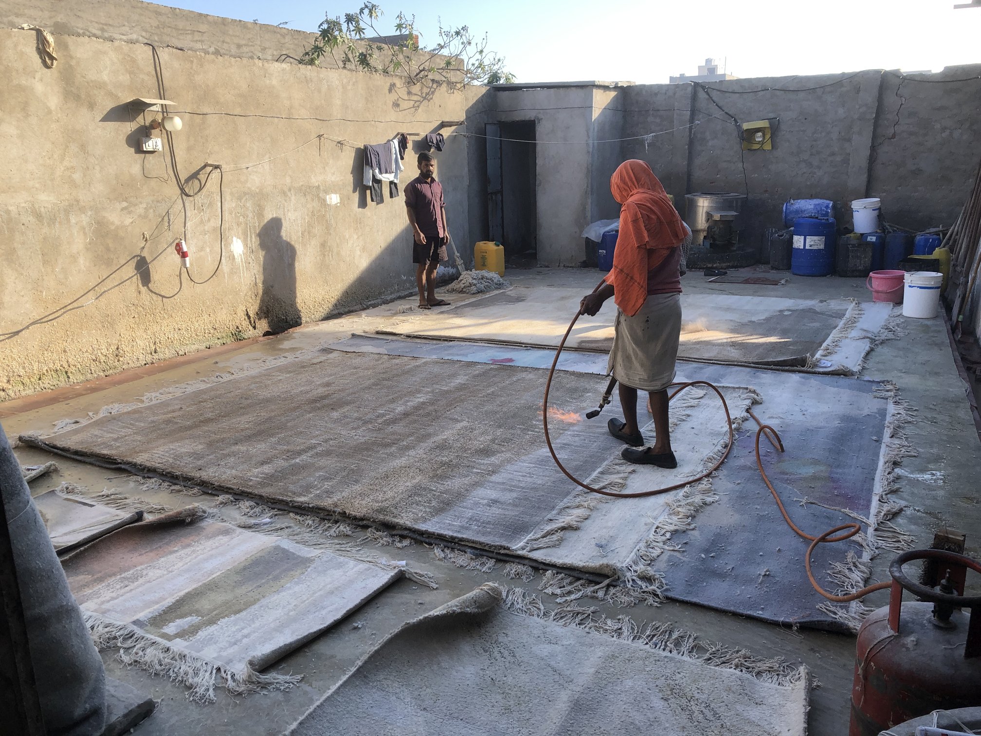 Zuerst bearbeitet eine schwere Maschine mit Walzen den Flor unter Zugabe von Wasser und Reinigungsmitteln — je nach Länge und Dichte mehrmals. Dann folgt das Handwaschen: ein arbeitsintensiver Prozess, der grundsätzlich von Männern ausgeführt wird. Mit speziellen Holzbrettern drücken sie das Wasser mit viel Kraft zu den Rändern des Teppichs, während andere ständig frisches Wasser nachschütten, bis das Wasser klar abläuft.