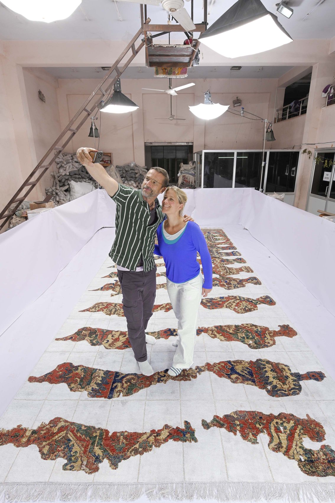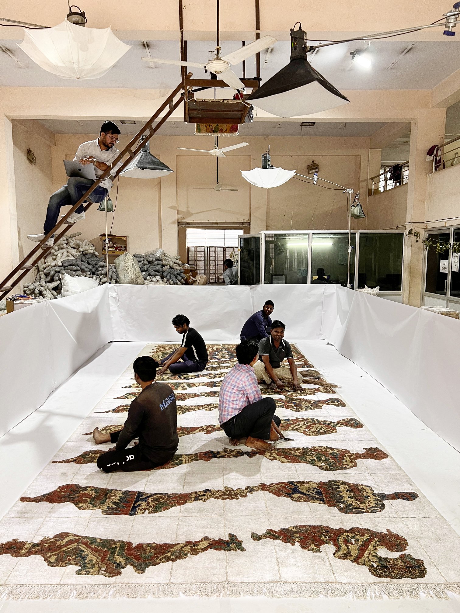Bevor der Teppich seine Reise nach Deutschland antritt, wird er fotografisch dokumentiert. In einem großen Raum ermöglicht ein Kragarm Aufnahmen von oben — so entstehen maßstabsgetreue Bilder des rund 3 × 6 Meter großen Teppichs, auf denen jedes Detail sichtbar ist.