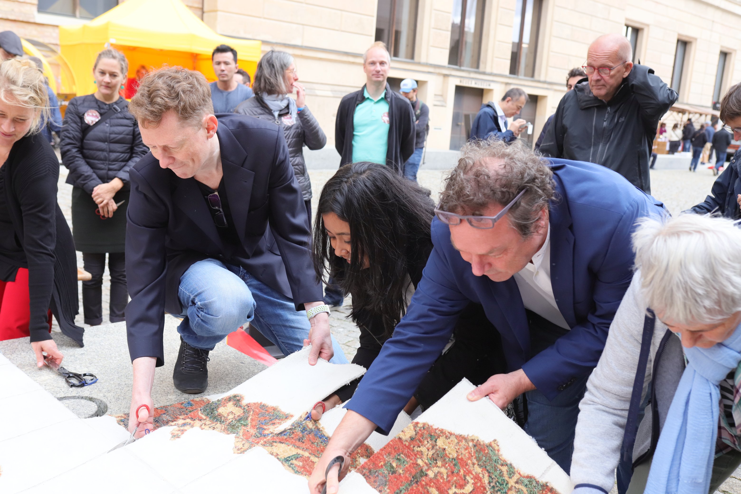 Am 23. September 2023 versammeln sich Menschen im Neuen Hof der James-Simon-Galerie zwischen Pergamonmuseum und Neuem Museum in Berlin. Was dann passiert, ist ungewöhnlich: Ein Teppich, der monatelang in Indien Knoten für Knoten entstanden ist, wird in 100 Teile geschnitten. Nicht als Zerstörung — sondern als Aufbruch.