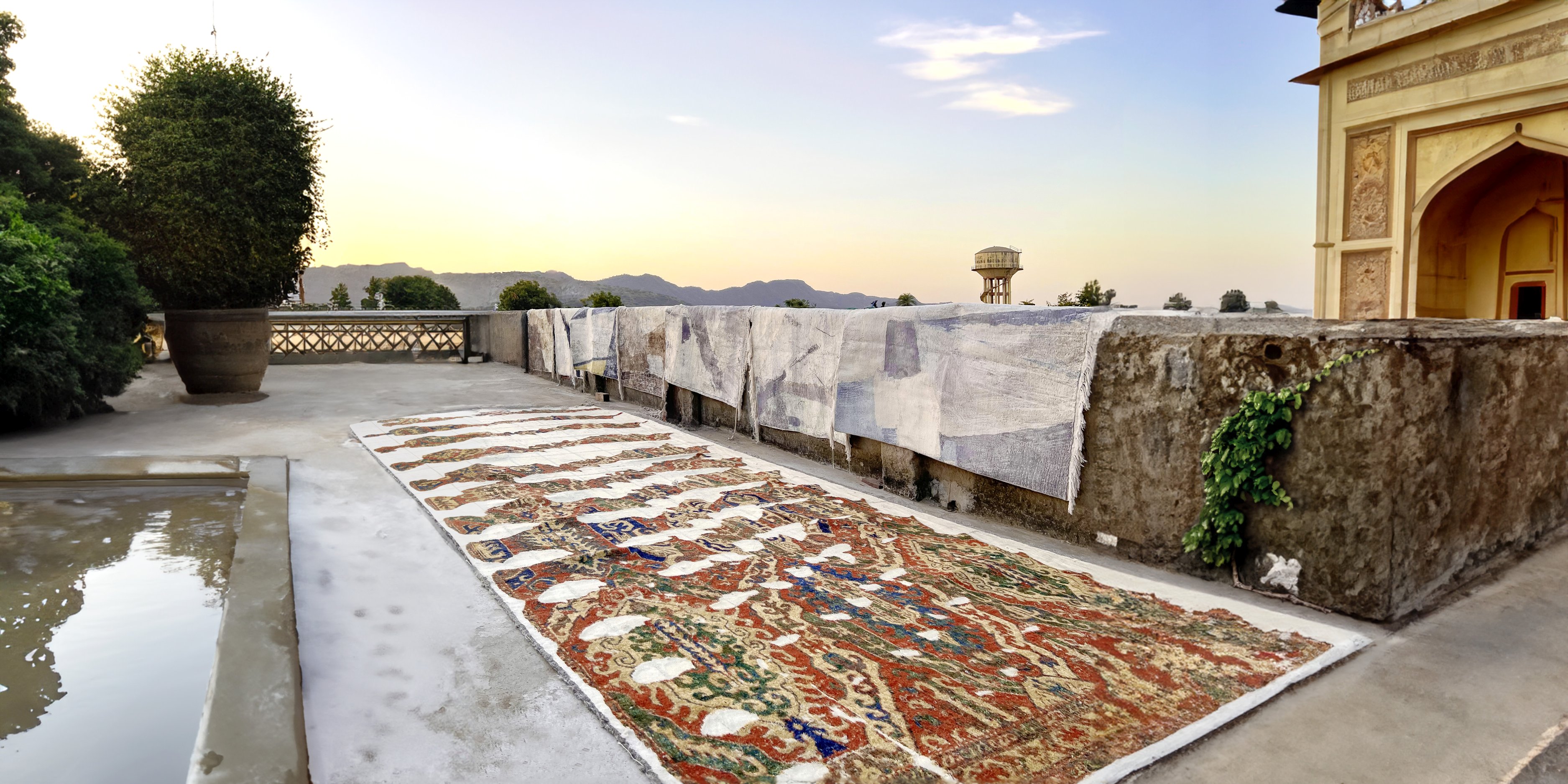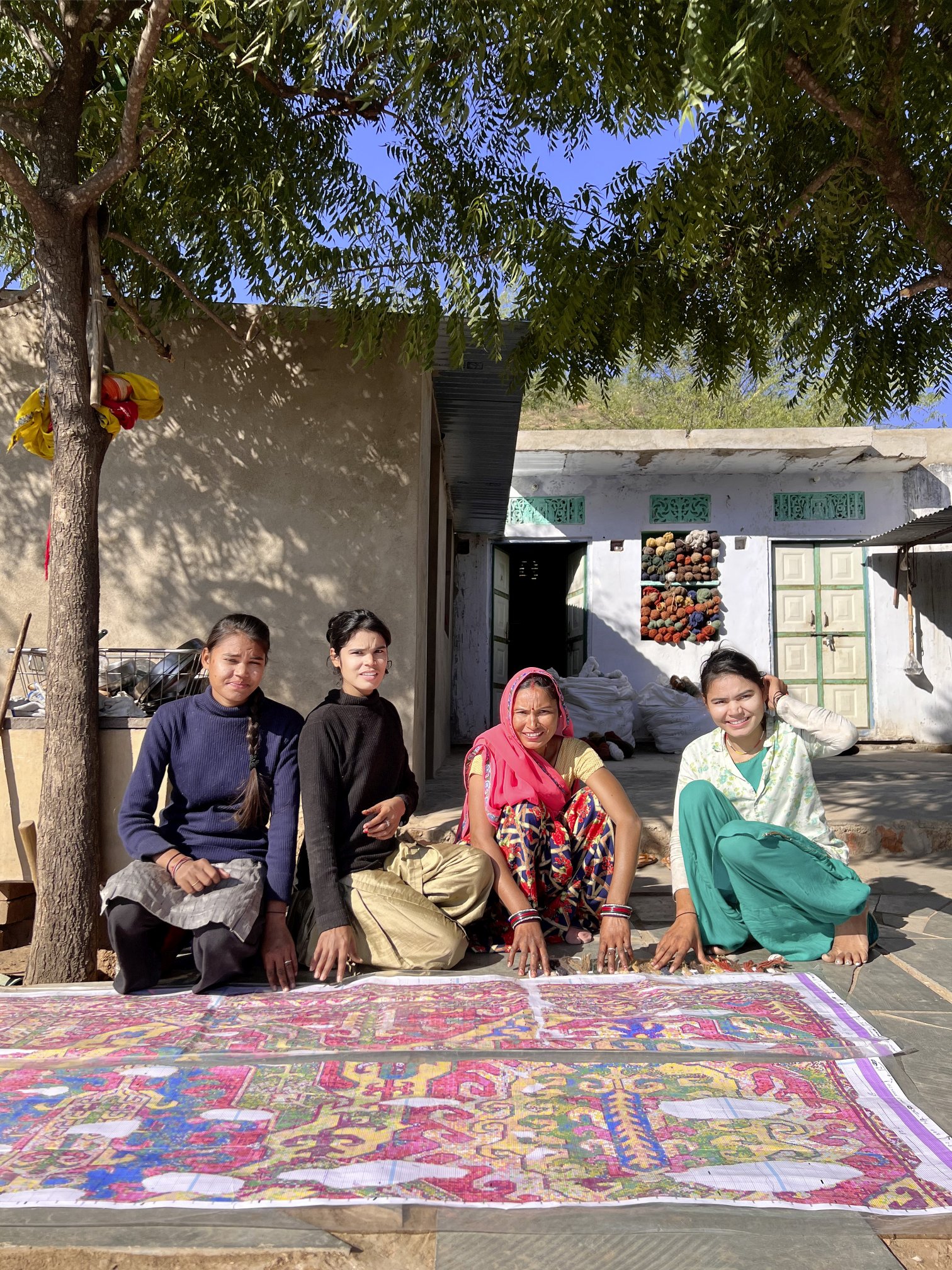 Im Jahr 2022 wird der Teppich in Indien produziert: von Dhanni Devi gemeinsam mit ihren drei Töchtern Meenakshi, Suman und Kiran Bunkar in einem kleinen Dorf unweit von Jaipur, Rajasthan. Der vertikale Webstuhl bietet gerade genug Platz für alle vier gleichzeitig.