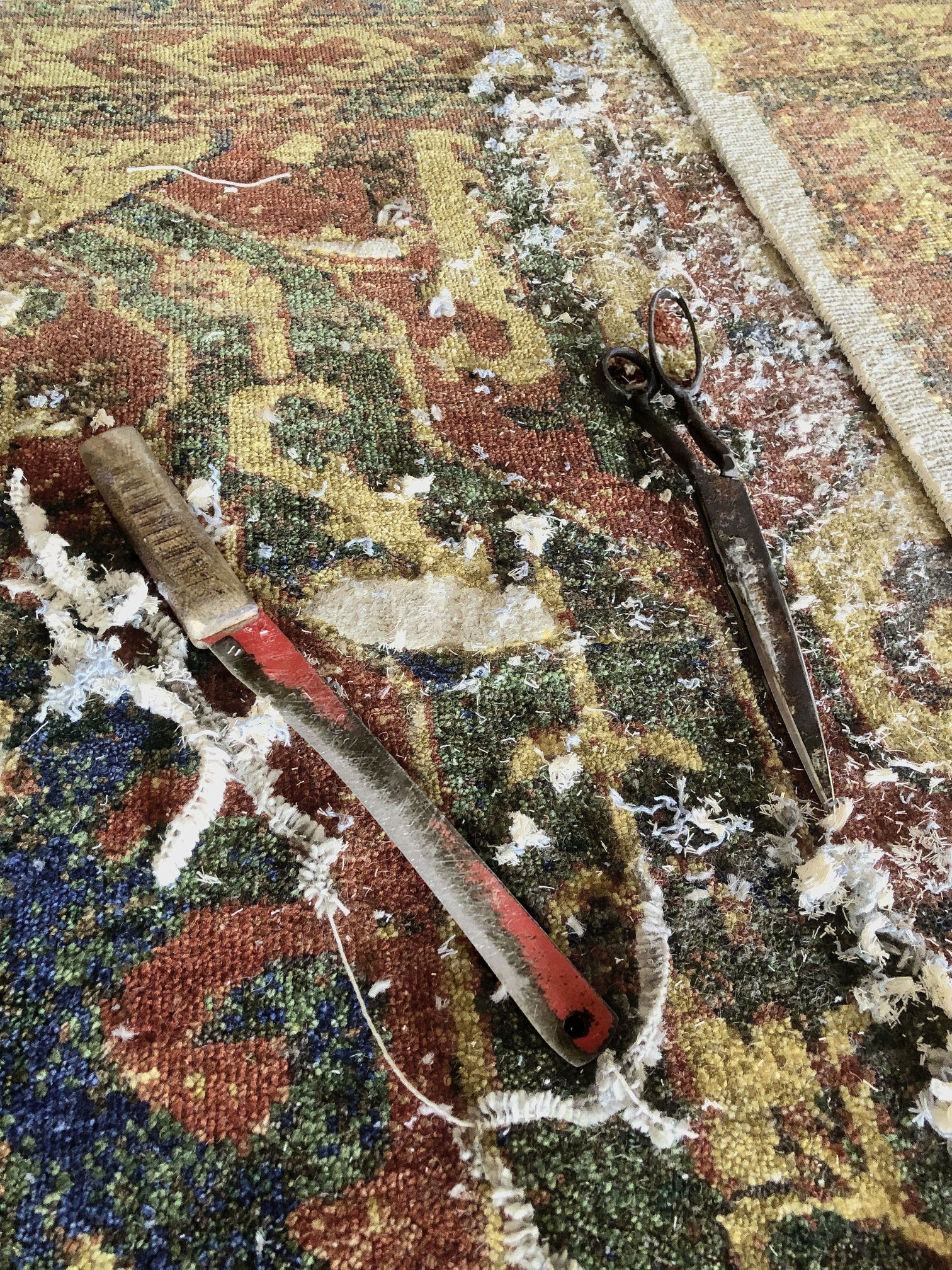 Früher hatten Teppiche an Ober- und Unterkante Fransen, die seitlichen Kanten waren durch die Schüsse gesichert. Heute werden alle vier Kanten nach dem Knüpfen gerade geschnitten und von Hand mit robusten Wollgarnen eingefasst. Das verhindert Wellen und Unregelmäßigkeiten — und sorgt dafür, dass der Teppich auch nach dem Schneiden in 100 Fragmente sicher und stabil bleibt.