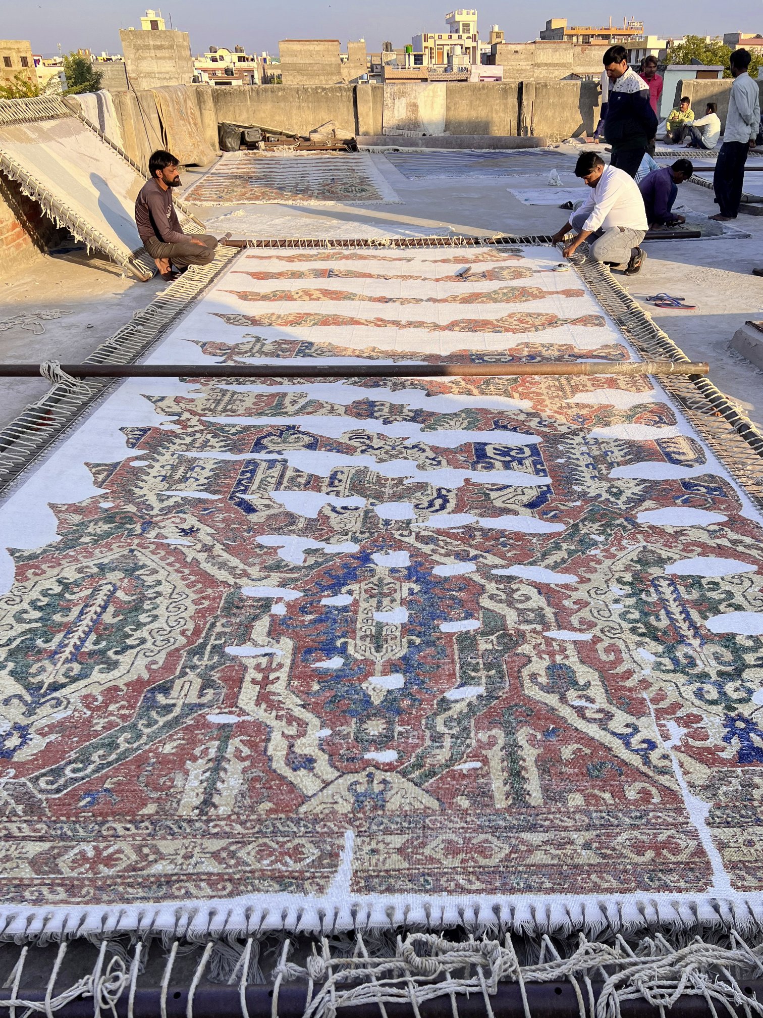 Zum Trocknen kommt der Teppich nach oben — auf das Dach der Werkstatt. Damit er dabei seine Form behält und das eingeknüpfte Raster möglichst rechtwinklig bleibt, wird er gespannt: Mehrere hundert Klemmen werden an allen vier Seiten fixiert und in einen Rahmen eingespannt.